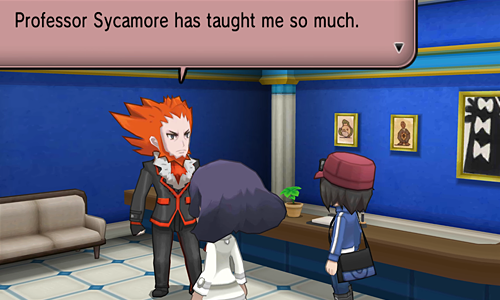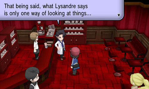 Of course, the most iconique Pokémon X&Y scene between them is the one in Lysandre's café, where they meet up with the player and actually talk to each other. Lysandre is introduced by Augustine with unabashed enthusiasm, and though Lysandre spends most of the exchange exposing himself as having less than savory intentions, Augustine dismisses most of it after he's left, and praises him further. (See the quote above!)